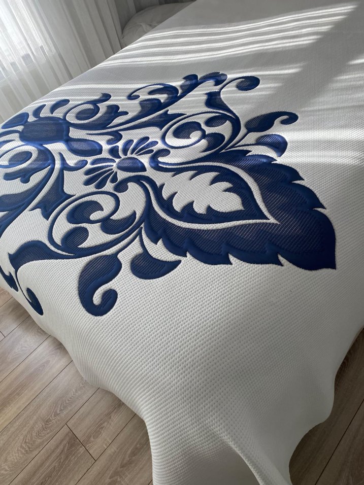 Bu yatak örtüsü, gri zeminde mavi tonlarında baskılı desene sahiptir ve yatak odasına ince bir dekoratif dokunuş katar. Kumaşı dokulu yüzeye sahiptir. ️