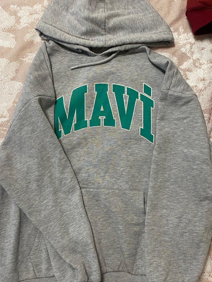 Gri renkli, kapüşonlu ve uzun kollu örme kumaştan yapılmış, rahat kesim kadın sweatshirt. Önünde "MAVİ" baskısı bulunur.