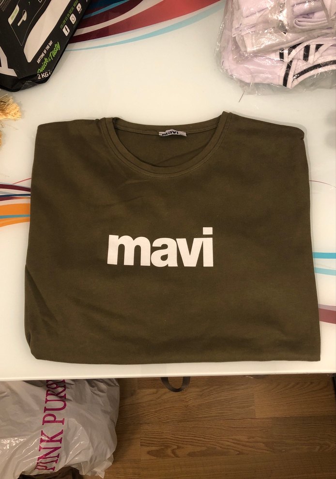 Bol kesim kahverengi erkek tişört, kısa kollu ve yuvarlak yaka. Önünde beyaz "mavi" baskı bulunur. Yumuşak kumaştan, günlük kullanım için uygundur.