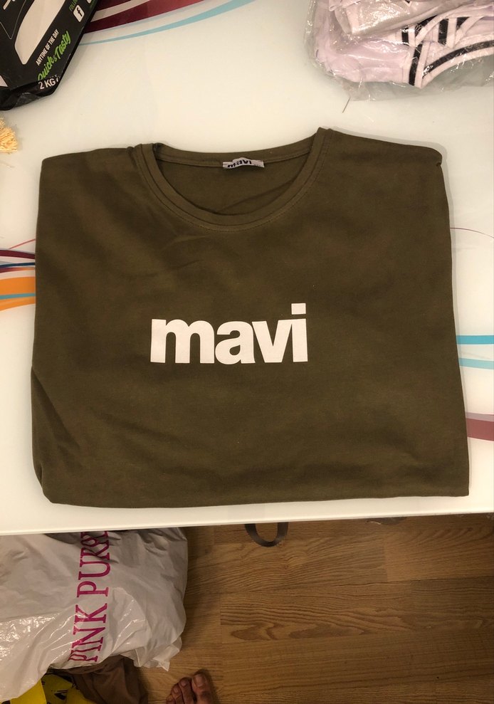 Pamuk kumaştan, baskılı 'mavi' yazılı, kısa kollu ve bisiklet yaka kahverengi erkek tişört. Rahat kesimiyle gündelik sokak stiline uygundur.