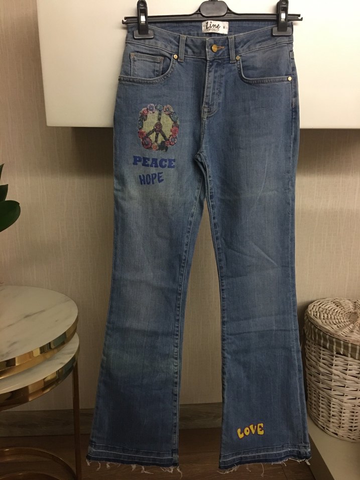 Mavi denim kumaştan, barış ve sevgi baskılı, kemerli detaylı, günlük rahat kullanım için normal kesim kadın pantolon. ✌️ S beden %100 Cotton çok hafif esnek 1 kere giyilmiştir, beden uymadığı için ekledim. Durmaktan kaynaklı çok hafif sararma var ama o çok fazla belli olmuyor. Ölçüleri:Boy 106, bel 36, kalça 46, düğmeden ağ kısmı 25 cm’dir. Ürünü inceleyip detaylı öyle alım yapın lütfen.