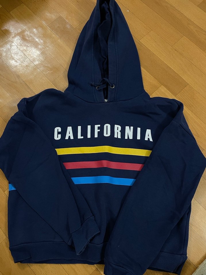Bu fitted kesim, koyu mavi sweatshirt, kapüşonlu ve fermuarlı detaylara sahiptir. 'CALIFORNIA' baskısı ve renkli çizgilerle günlük kullanıma uygundur.
