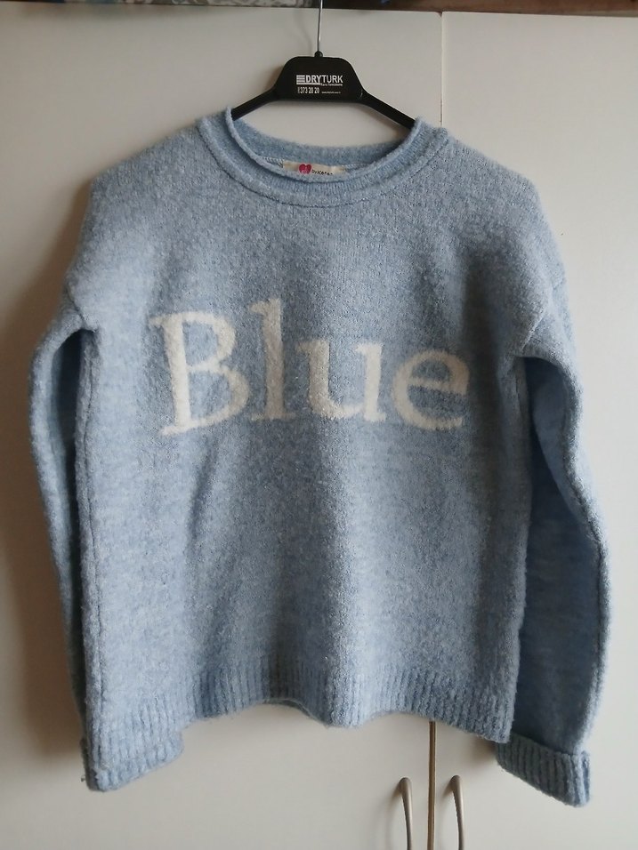 Kadınlar için mavi renkli, baskılı "Blue" yazılı, uzun kollu, yuvarlak yaka, rahat kesim kazak. Yumuşak örme kumaştan üretilmiştir.