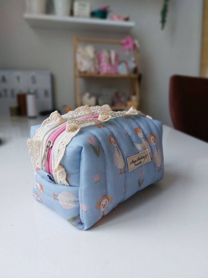 Pamuk kumaştan, baskılı ve fermuarlı mavi pastel renkte makyaj çantası. Günlük kullanıma uygun, rahat ve karşı kültür tarzı bir ürün.