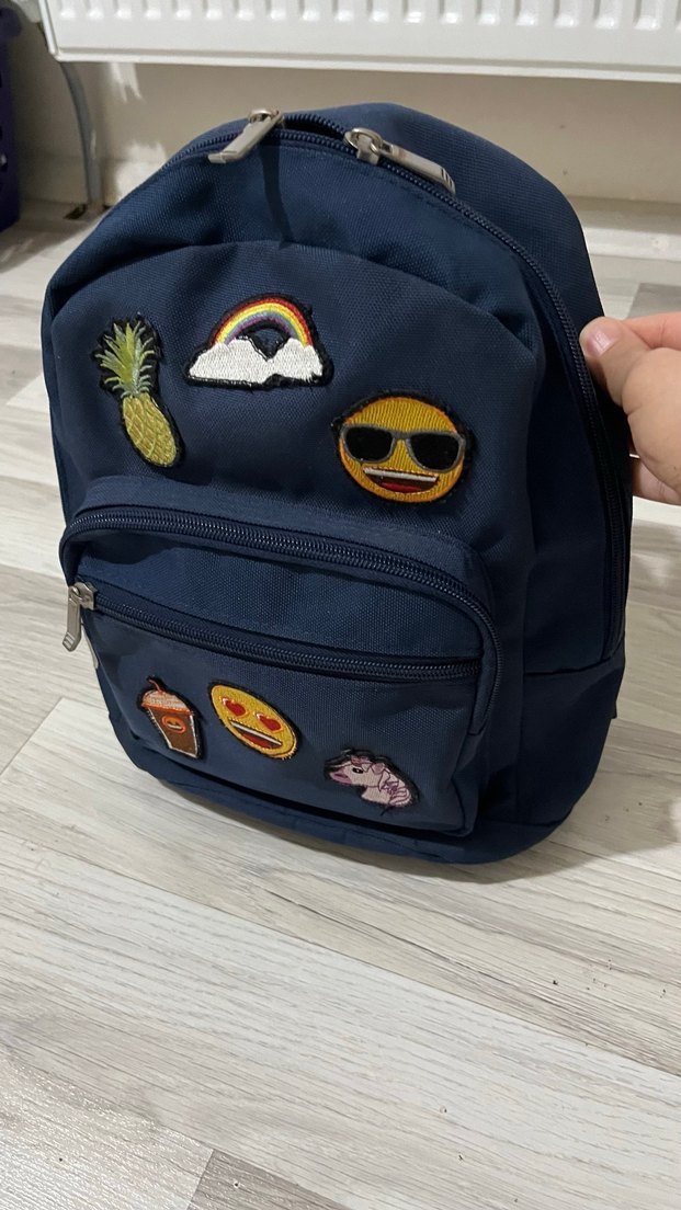 Koyu mavi baskılı ve tokalı kapanışa sahip, minimalist sokak stili için uygun kadın sırt çantası.