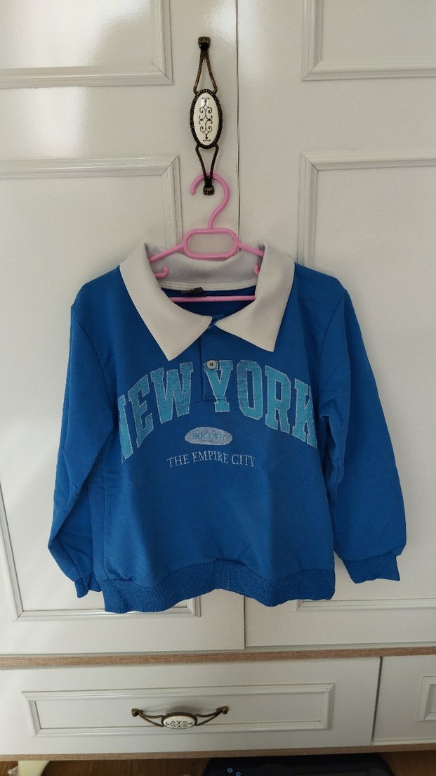 Beyaz düğmeli yakaya sahip, uzun kollu ve bol kesim mavi sweatshirt. "NEW YORK" baskılı ve yumuşak, sıcak tutan kumaştan üretilmiştir.