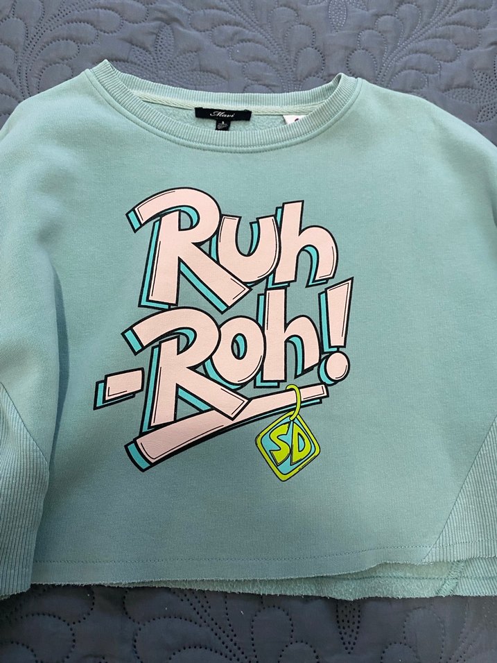 Pastel mavi renkli, bol kesim kadın sweatshirt. Yuvarlak yaka ve uzun kollu, 'Ruh-Roh!' baskılı ve fırfır detaylı, yumuşak ve sıcak kumaştan.