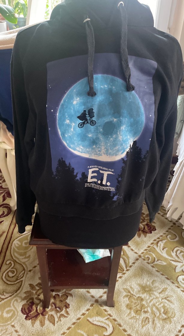 Uzun kollu, bol kesim sweatshirt, E.T. filminden mavi baskıya sahip. Yuvarlak yaka ve yumuşak kumaş dış mekan kullanımı için uygundur.