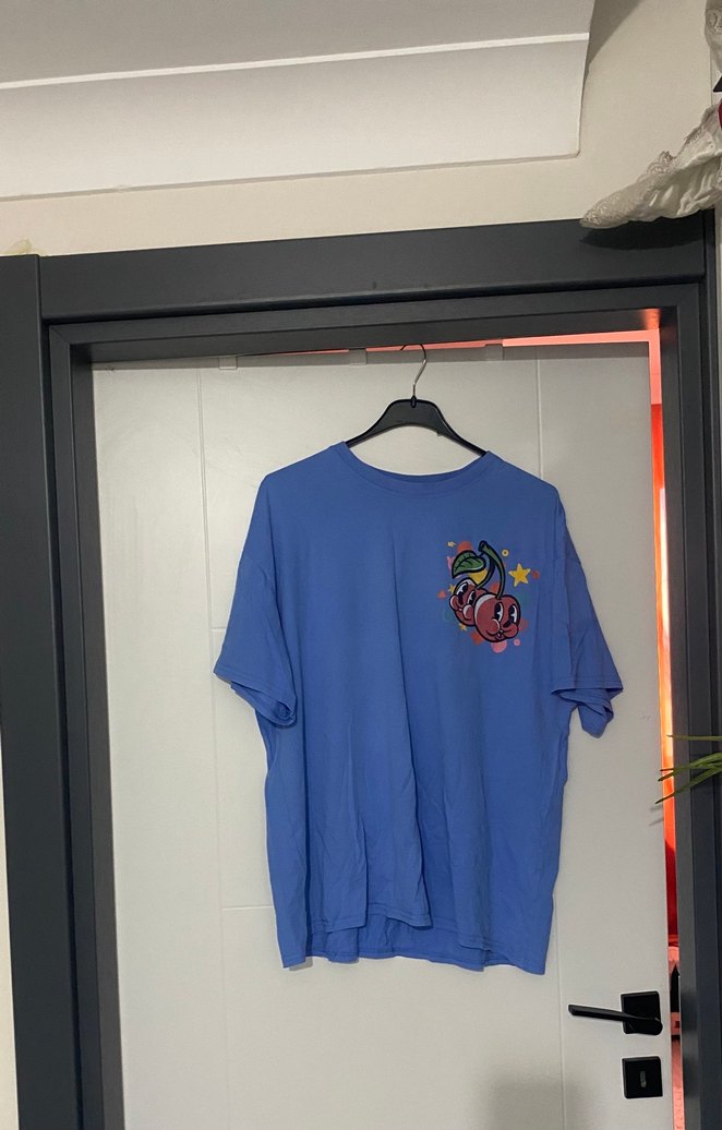 Mavi pamuklu, kısa kollu, yuvarlak yaka, baskılı, bol kesim kadın tişörtü. Cırt cırt detayıyla rahat ve günlük kullanıma uygun.
