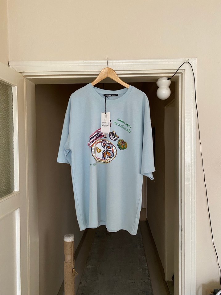 Pamuk kumaştan, kısa kollu ve bisiklet yaka mavi tişört. Rahat kesimi ve baskılı deseniyle günlük sokak stili için uygun.