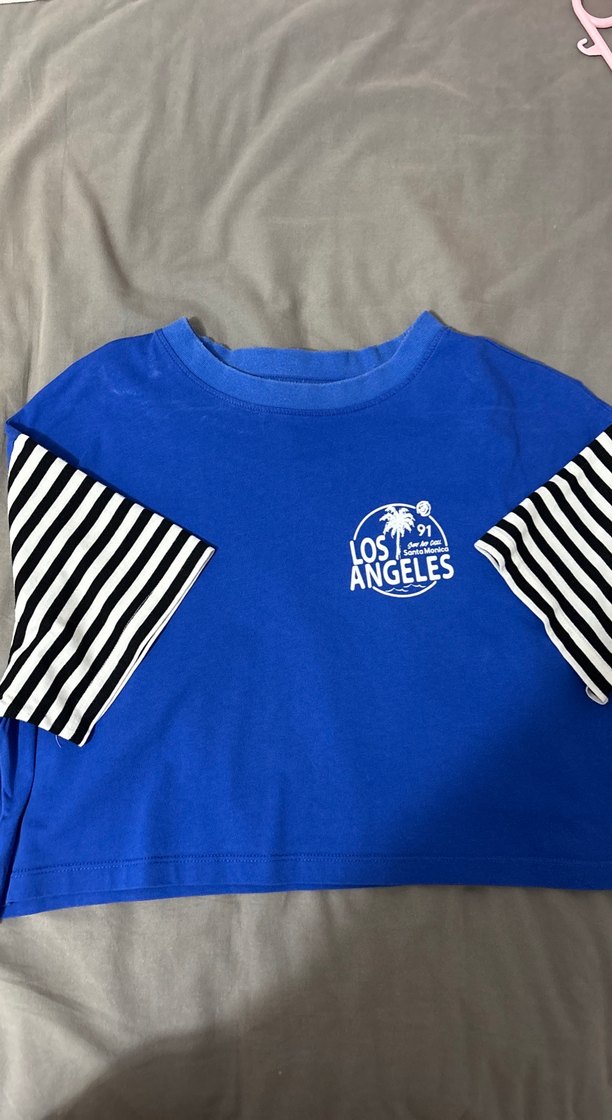 Mavi kadın tişörtü, kısa kollu ve siyah-beyaz çizgili pile detaylara sahiptir. Yuvarlak yaka, bol kesim ve 'Los Angeles' baskılıdır. Sentetik kumaştan üretilmiştir.