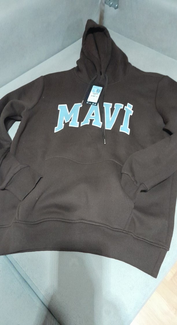 Yumuşak fleece kumaştan, bol kesim uzun kollu kahverengi kapüşonlu sweatshirt. MAVI baskılı ve cırt cırt detaylı, rahat sokak stili.