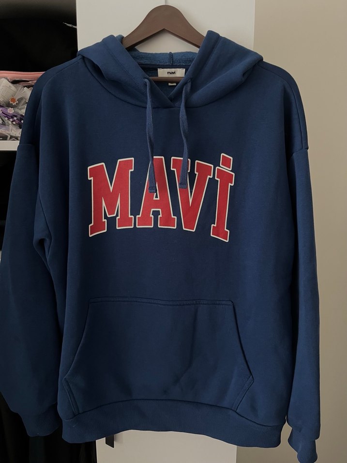 Koyu mavi, kapüşonlu ve uzun kollu kadın sweatshirtü, yumuşak ve sıcak kumaştan. Bol kesim, önünde "MAVI" baskısı ve kanguru cebine sahip. Rahat kullanım için ideal.
