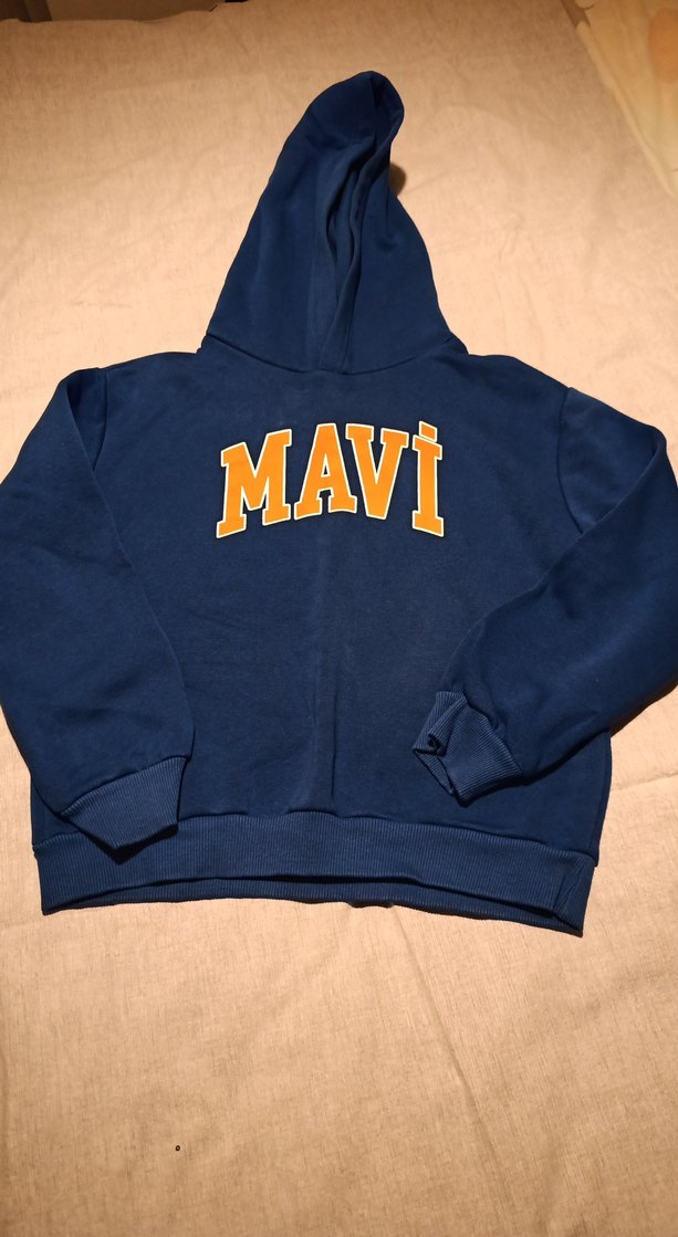 Koyu mavi renkte, kapüşonlu ve uzun kollu kız cocuk sweatshirt.