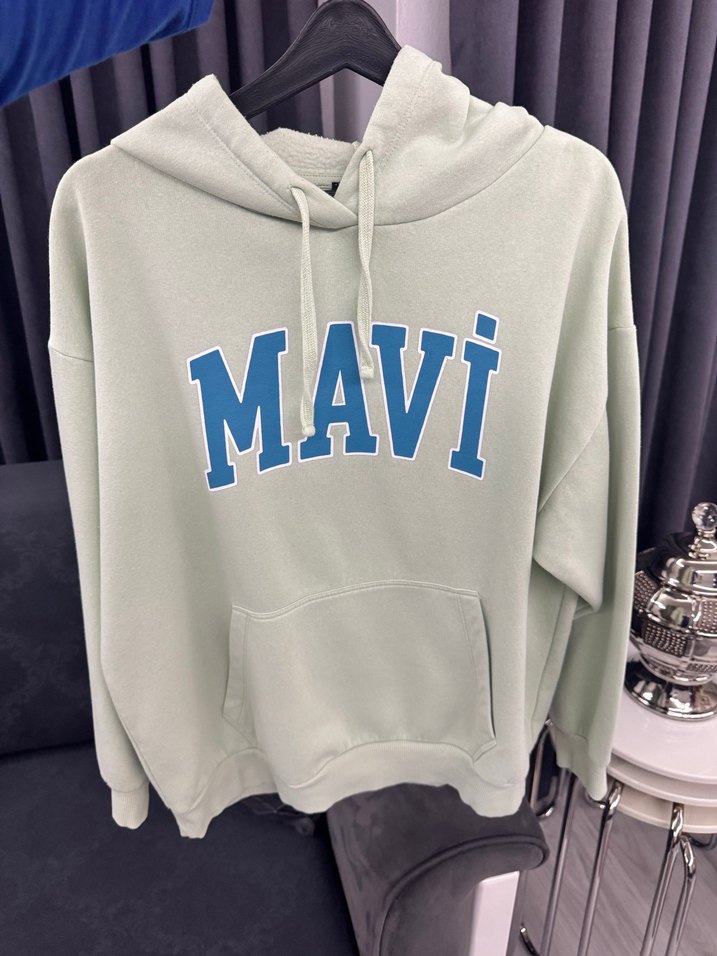 Gri renk, kapüşonlu ve uzun kollu, mavi "MAVI" baskılı rahat kesim sweatshirt. Yumuşak ve sıcak kumaştan, günlük kullanım için uygundur.
