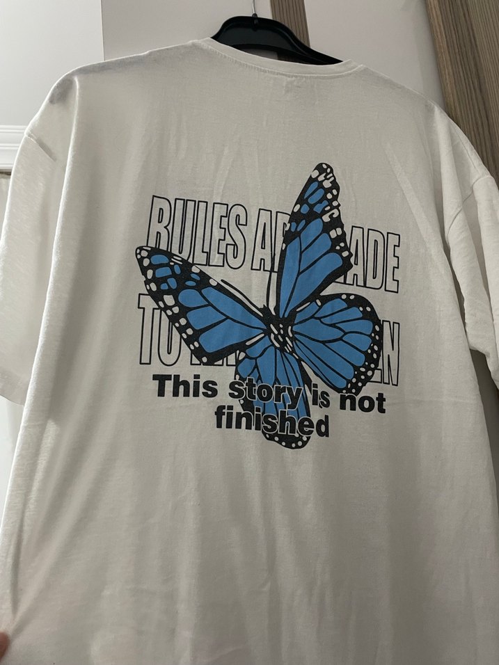 Rahat kesim, kısa kollu, bisiklet yaka kız tişörtü. Üzerinde baskılı mavi kelebek ve "This story is not finished" yazısı var. Sentetik kumaş, fırfırlı detaylı, trend stil.