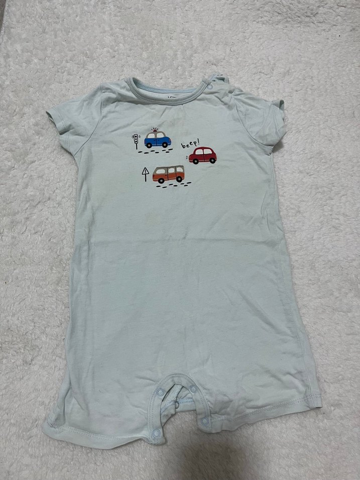 Pamuklu, kısa kollu, mavi baskılı bebek tulumu. Örme dokulu, bisiklet yaka ve sokak tarzına uygun rahat bir modeldir.