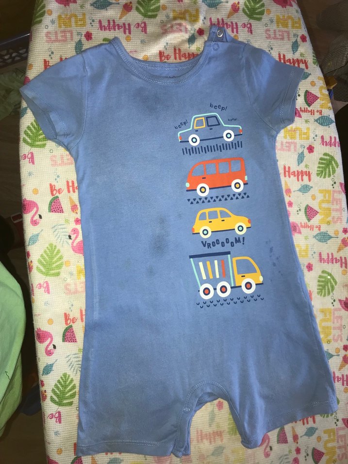 Mavi renkli, kısa kollu, bisiklet yaka erkek bebek tulumu. Renkli araç baskıları ve yumuşak tekstil kumaşından üretilmiştir. Omuzda çıtçıt detayı bulunur.