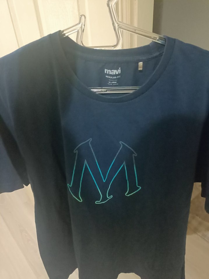 kadın/erkek için kısa kollu, bisiklet yaka ve baskılı 'M' desenli koyu mavi denim tişört, rahat sokak stiline uygun. hasarsız tertemiz. çok az kullanılmıştır.