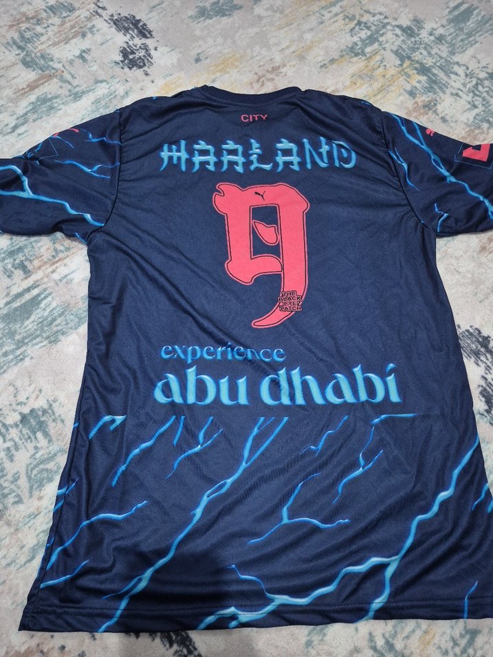 Koyu mavi renkli, baskılı, kısa kollu, bisiklet yaka erkek tişört. Sentetik kumaştan, drapeli ve normal midi boyda, atletik sokak stiline uygun. manchester city haaland