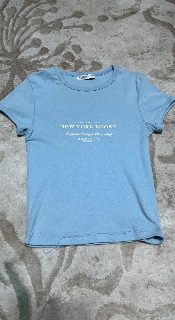 Mavi renkli, baskılı ve kısa kollu, bisiklet yaka, denim kumaşlı, normal uzunlukta kadın bluz