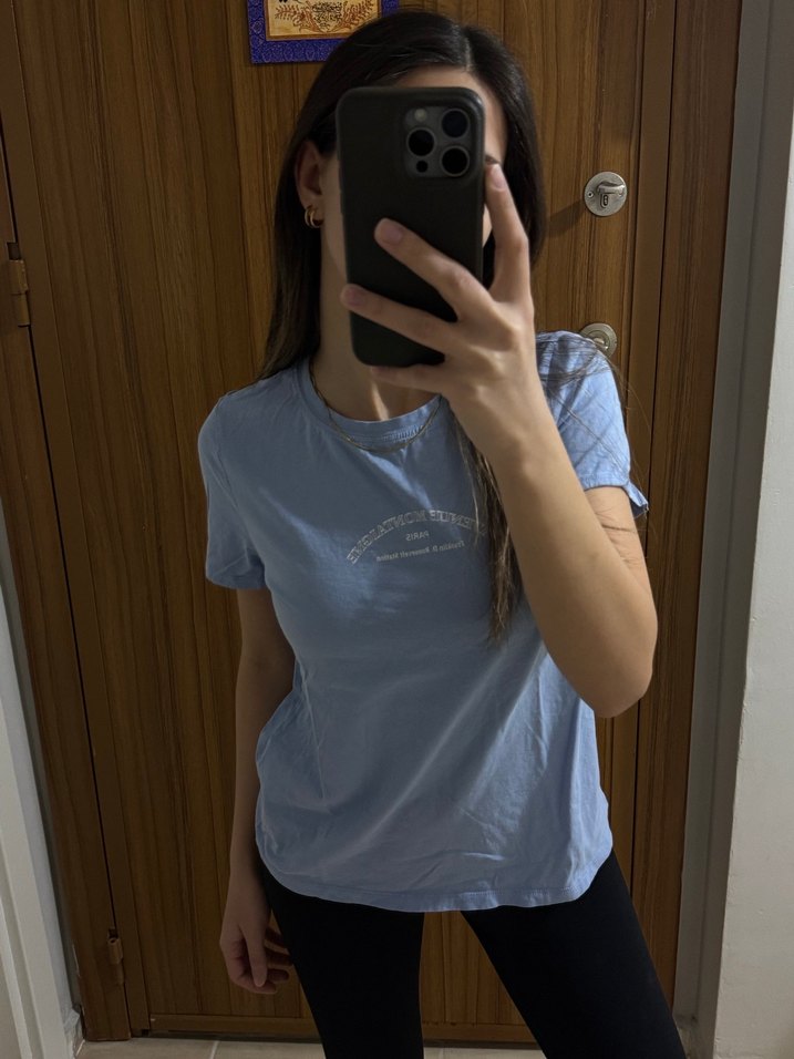 Kadınlar için kısa kollu, bisiklet yaka ve baskılı desenli pastel mavi tişört. Yumuşak denim kumaştan, günlük rahat ve şık bir görünüm sunar.