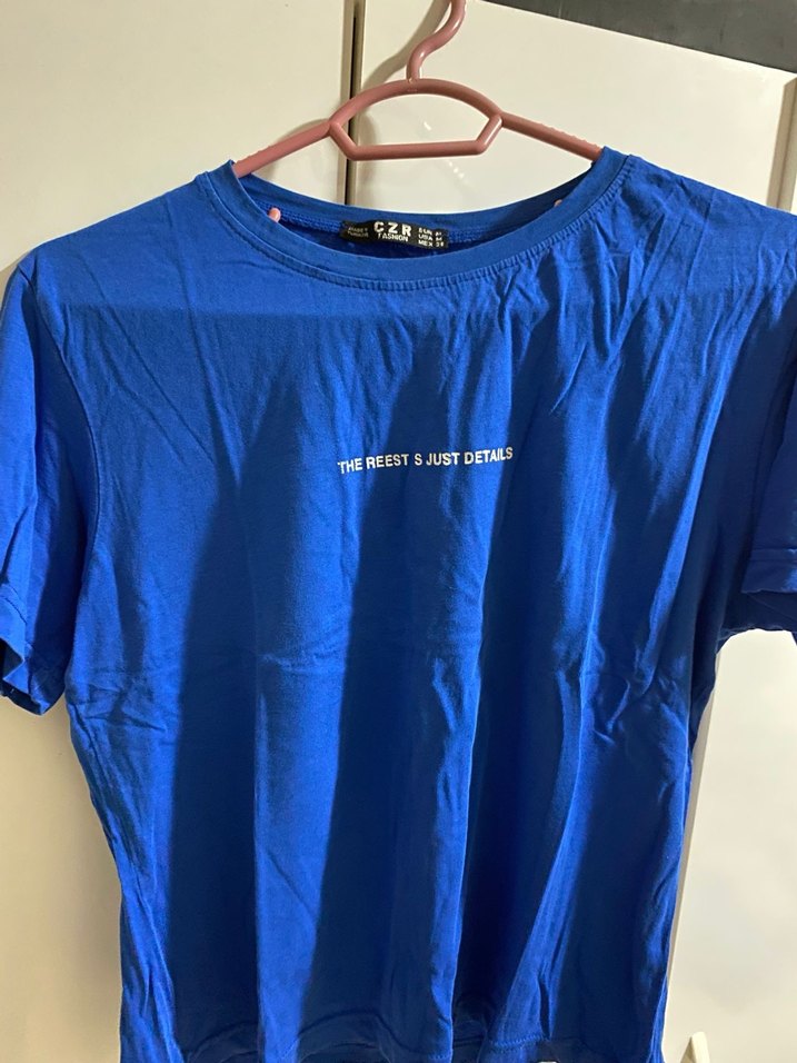 Mavi denim kısa kollu, yuvarlak yaka ve bol kesim kadın tişörtü. Üzerinde "THERE EST S JUST DETAILS" baskısı bulunur, günlük ve sokak stili için uygun.