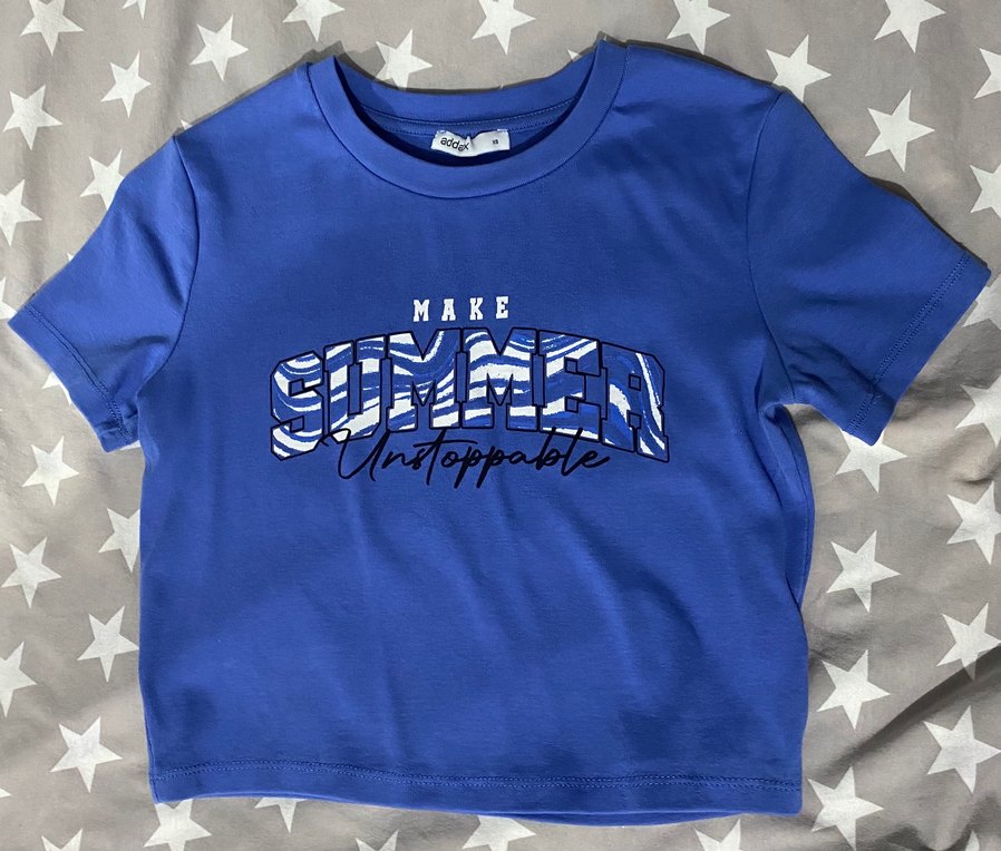 Mavi denim kısa kollu kadın tişörtü, renkli baskılı "MAKE SUMMER Unstoppable" yazısıyla. Salaş kesim ve bisiklet yakalı, günlük ve sokak stili için uygun.