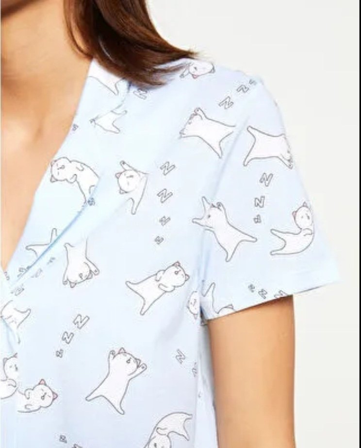 Kısa kollu, mavi pastel renkli, baskılı kedi desenli, bol kesim midi uzunlukta rahat kadın pijaması, hiç kullanılmadı