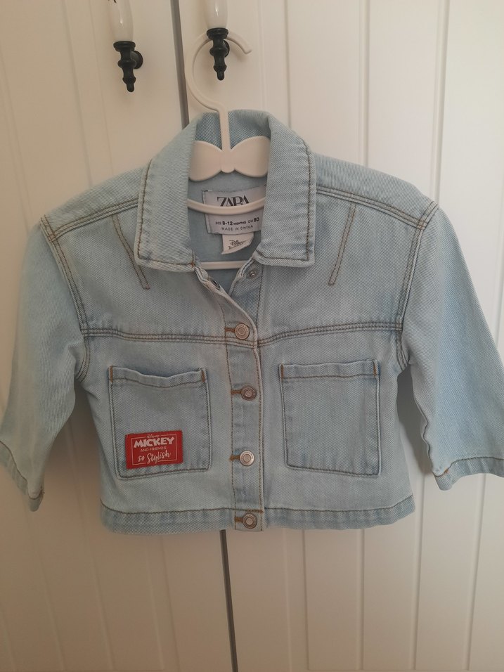 Baskılı detaylara sahip pastel mavi renk kız çocuk denim ceketi, düğmeli ön ve iki cep ile şık bir görünüm sunar.