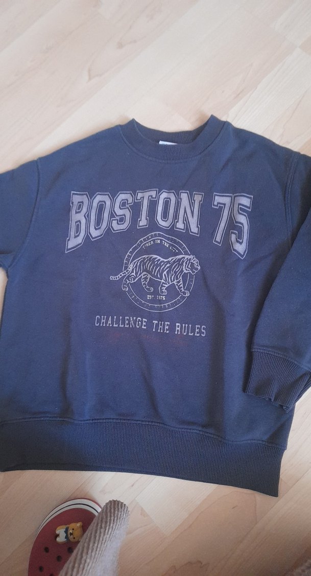 Mavi, koyu tonlarda, yuvarlak yakalı ve uzun kollu, bol kesim bir sweatshirt. "BOSTON 75" ve "CHALLENGE THE RULES" baskılı, yumuşak ve sıcak kumaştan. Günlük ve sokak stili için uygundur.