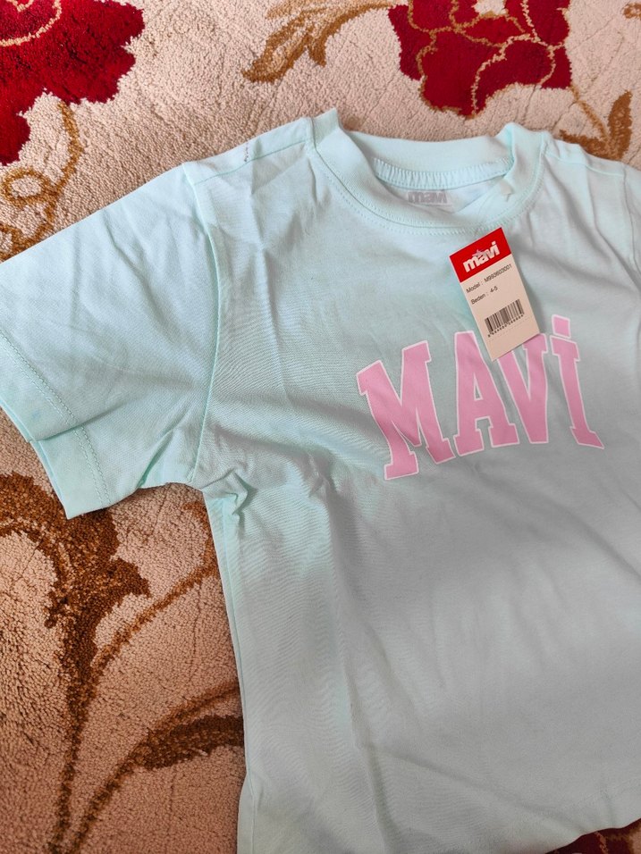 Pamuklu, bol kesim, yuvarlak yaka ve pembe pastel renkte kız çocuk tişörtü. Üzerinde 'MAVI' baskısı bulunur, rahat sokak stili için uygun. orijinal sıfır kullanılmamış 4/5 yaş