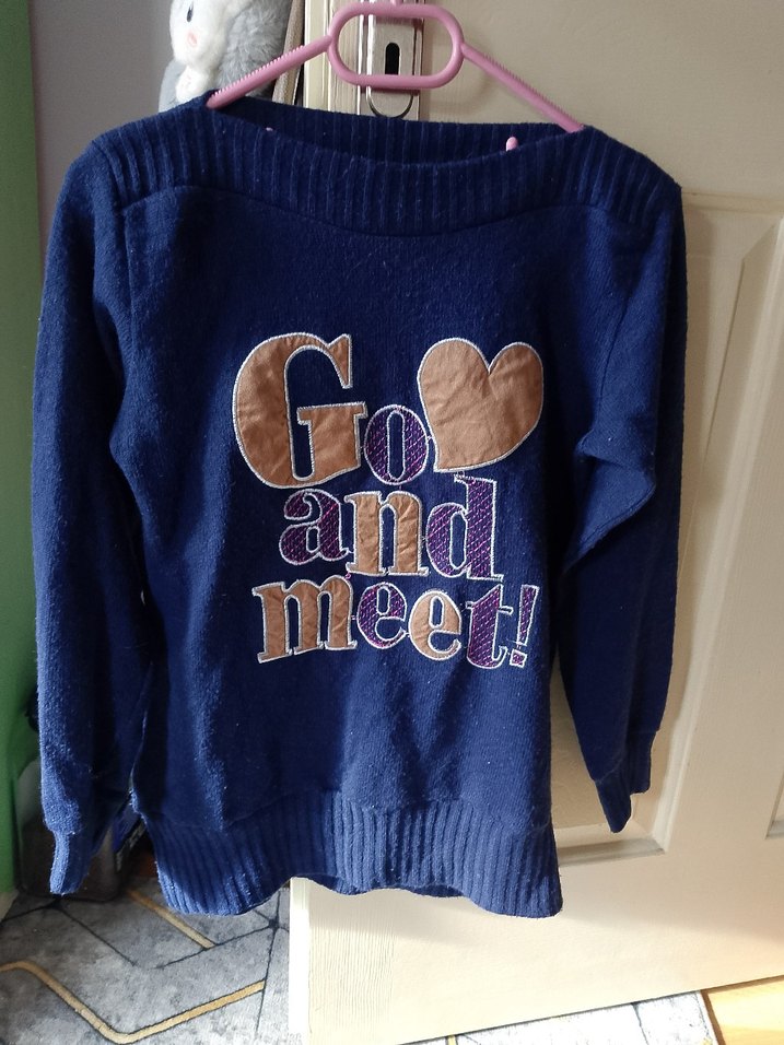 Mavi renkli, uzun kollu ve bisiklet yaka triko kazak. Bol kesim ve parlak baskılı 'Go and meet!' yazısı bulunur. Trendy günlük stil için uygundur. S bedendir.Hafif tüylenme mevcut.