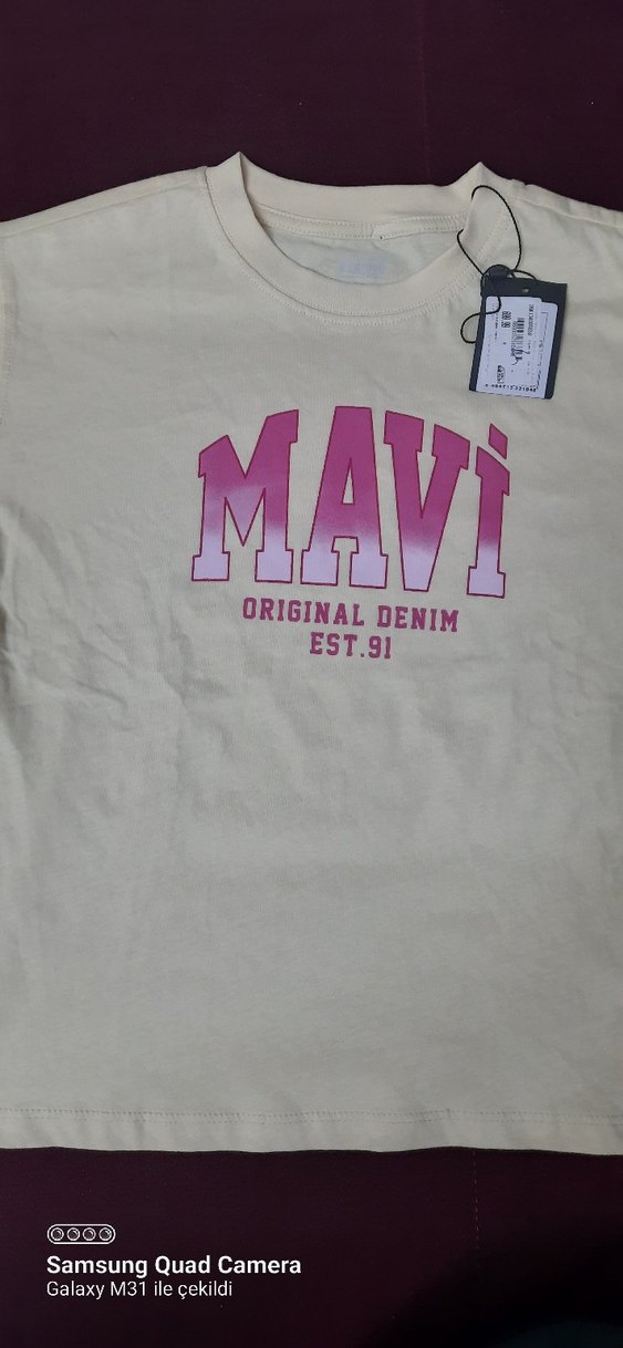 Pamuk kumaştan, kısa kollu ve bol kesim kız tişörtü. Yuvarlak yaka ve pembe "MAVI ORIGINAL DENIM EST.91" baskılı, gri renkte. Sokak stiline uygun.