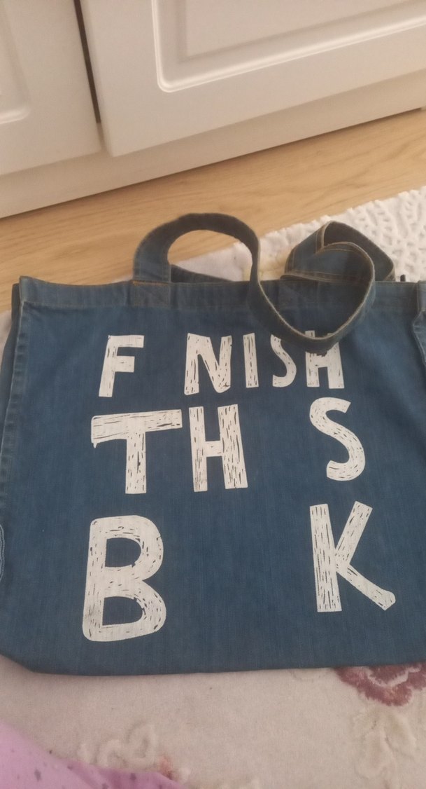 Mavi kot kumaştan yapılmış kadın omuz çantası, beyaz baskılı harfler ve tokalı askıya sahiptir. Parlak görünümlü ve günlük kullanım için uygundur.
