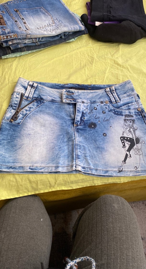 Mavi kot kumaştan üretilmiş, tokalı ve baskılı tasarımlı, rock punk tarzına uygun kısa ve dar kesim mini etek. ✨