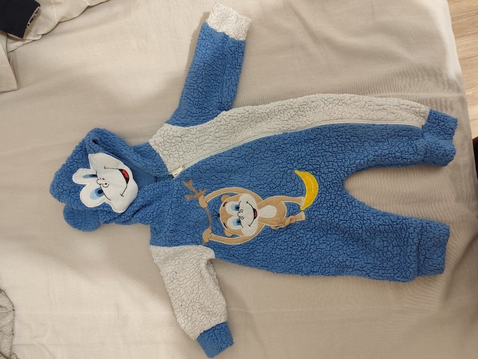 Yumuşak ve sıcak kumaştan yapılmış, renkli baskılı ve kürk detaylı bebek tulumu. Kapüşonlu ve kolay giyim için fermuarlı.