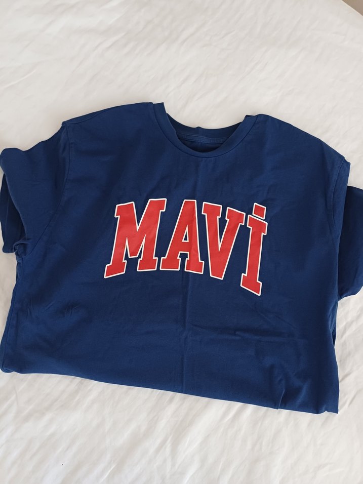 Orijinal Mavi tişört. 2-3 kez ancak giyildi. Üzerinde minik minik saç boyası izleri var.