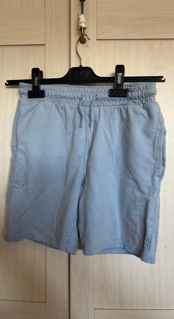 Pastel mavi baskılı, fermuarlı detaylı, pamuk kumaştan yapılmış, normal boyda ve vücuda oturan hamile şortu. Rahat ve gündelik normcore stilinde.