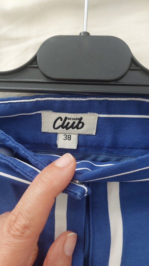 Pamuklu, düğmeli ve fitted kesim mavi baskılı midi şort. Parlak kumaşıyla günlük kullanıma uygun, sokak modası tarzında. Beden 38.