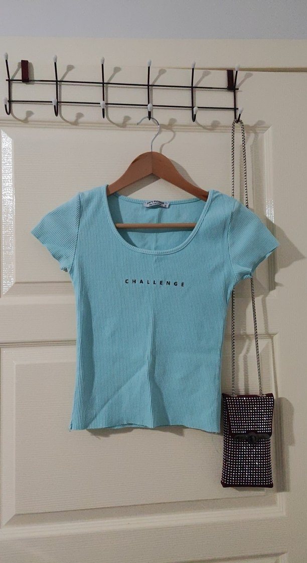 Mavi renkli, baskılı 'CHALLENGE' yazılı kısa kollu, dar kesim denim T-shirt. Yuvarlak yaka ve kısa boyuyla sokak tarzına uygun şık bir parça.