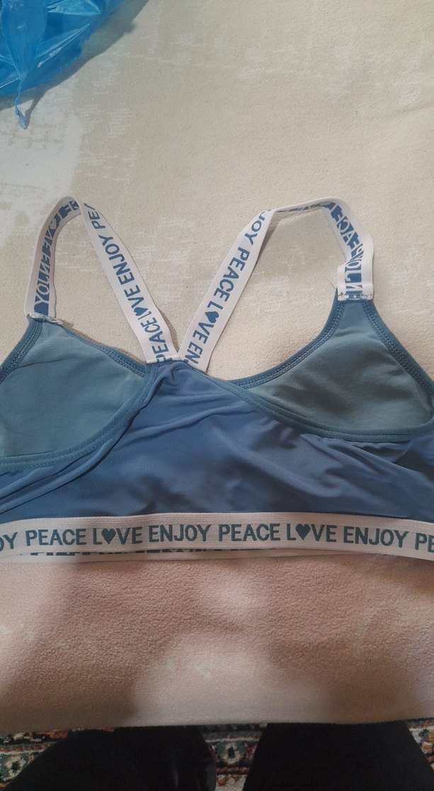 Mavi ve gri renklerde, baskılı askıları ve kısa mini boy tasarımıyla street wear tarzı spor sütyeni.