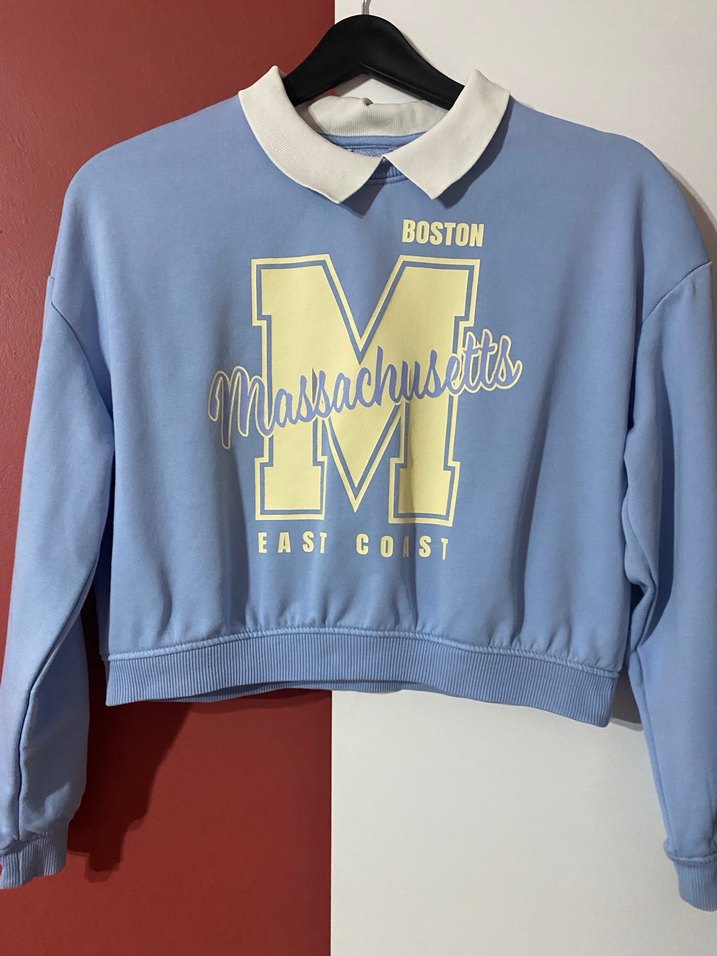 Pastel mavi renkte, düğmeli ve yakalı, baskılı 'Boston Massachusetts East Coast' yazılı, bol kesim ve mini uzunlukta yumuşak ve sıcak kumaştan sweatshirt. İhracat fazlası H&M ürünüdür etiketi kesikbüyük olasılıkla 10 yaştır ama siz yinede ölçülere göre karar verin ölçüler fotoğraflarda mevcut#####