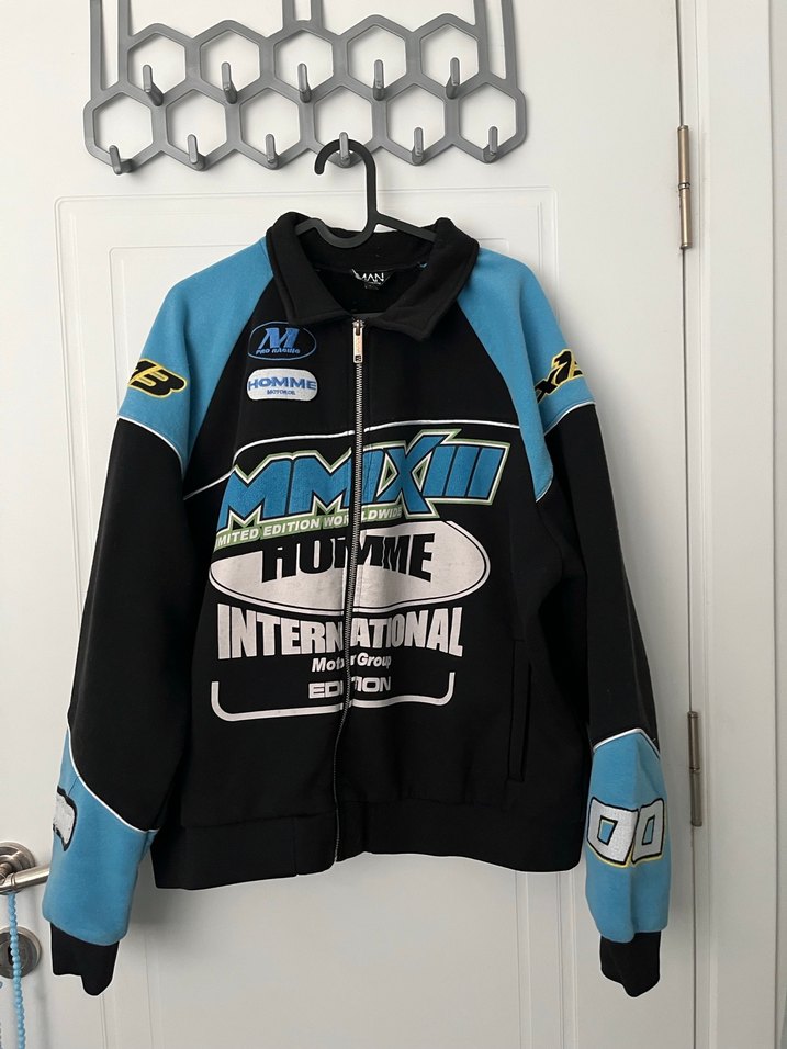 Mavi Baskılı Motorcu Tarzı Spor Ceket