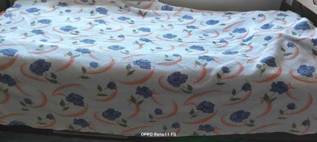 Hafif mavi renkte, baskılı çiçek desenli, geleneksel tarzda masa örtüsü. Yumuşak renkler ve zarif tasarım içerir.