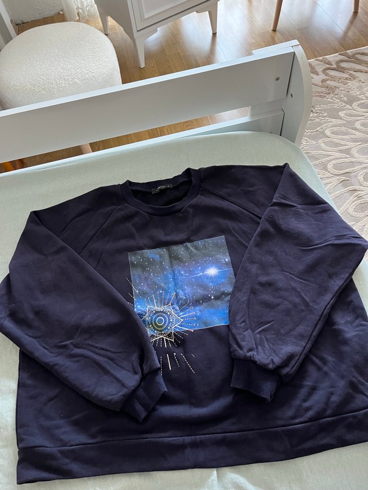 Uzun kollu, bisiklet yaka, rahat kesim koyu mavi sweatshirt. Önünde baskılı kozmik desen bulunur, yumuşak ve sıcak kumaştan üretilmiştir. Günlük kullanım için uygundur. Defosu yok