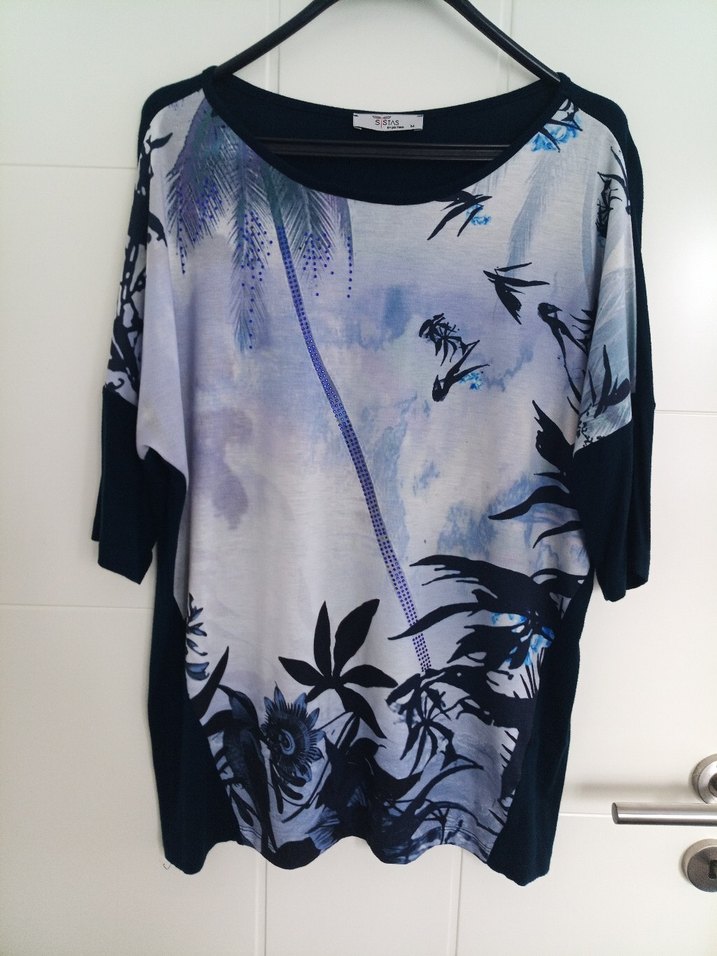 Salaş kesim, mavi baskılı, ipeksi dokulu bluz. Kısa kollu ve yuvarlak yakalı, günlük kullanıma uygun.