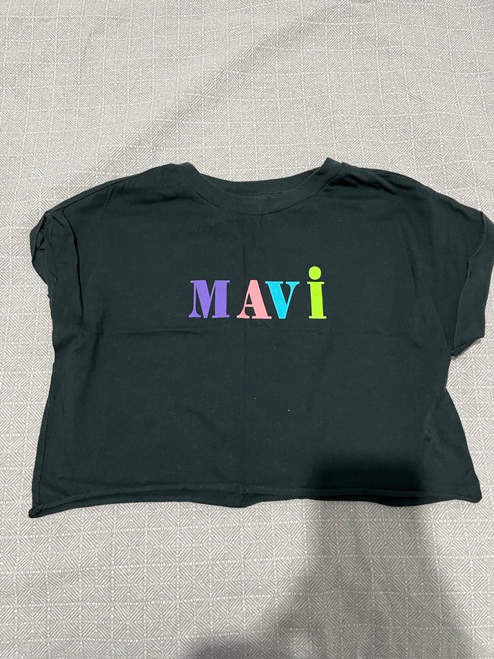Renkli MAVİ baskılı, kısa kollu, siyah pamuklu, bol kesim kadın tişörtü. Bisiklet yaka ve normal boyda, günlük kullanıma uygun.hiç bir sorunu yoktur