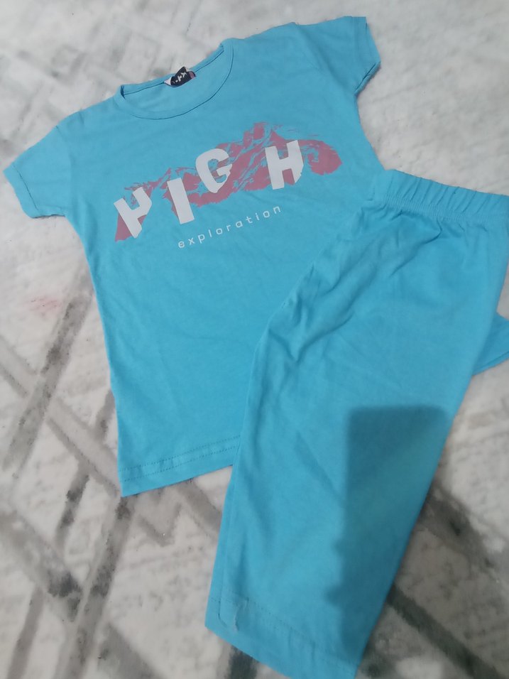 Pastel mavi renkte, kısa kollu ve bisiklet yaka, baskılı yazılı üst ve şortlu kız çocuk takım.4/5 yaşa uygun 0 ürün
