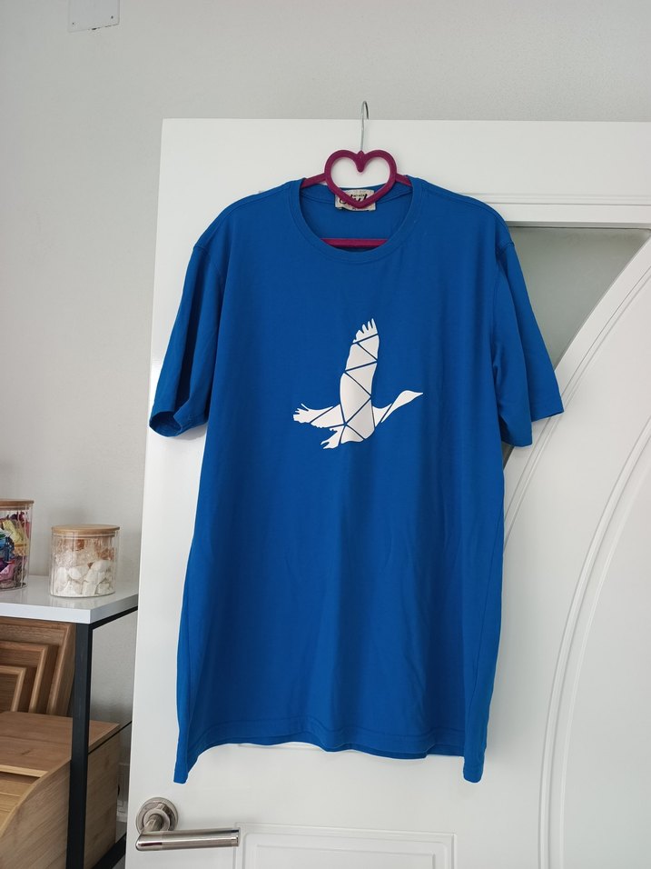Pamuklu, kısa kollu, mavi tişörtü. Baskılı kuş deseni ve rahat bol kesimiyle günlük kullanım için uygundur. ️